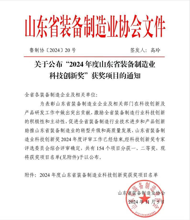 “2024 年度山東省裝備制造業(yè)科技創(chuàng)新獎(jiǎng)”二等獎(jiǎng)。